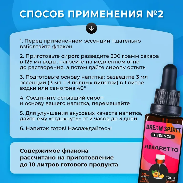 Погрузитесь в мир итальянской роскоши и изысканности с эссенцией Dream Spirit "Амаретто", которая подарит вашему алкогольному напитку деликатные нотки миндаля, сладости и тонкие оттенки сочного средиземноморского апельсина.