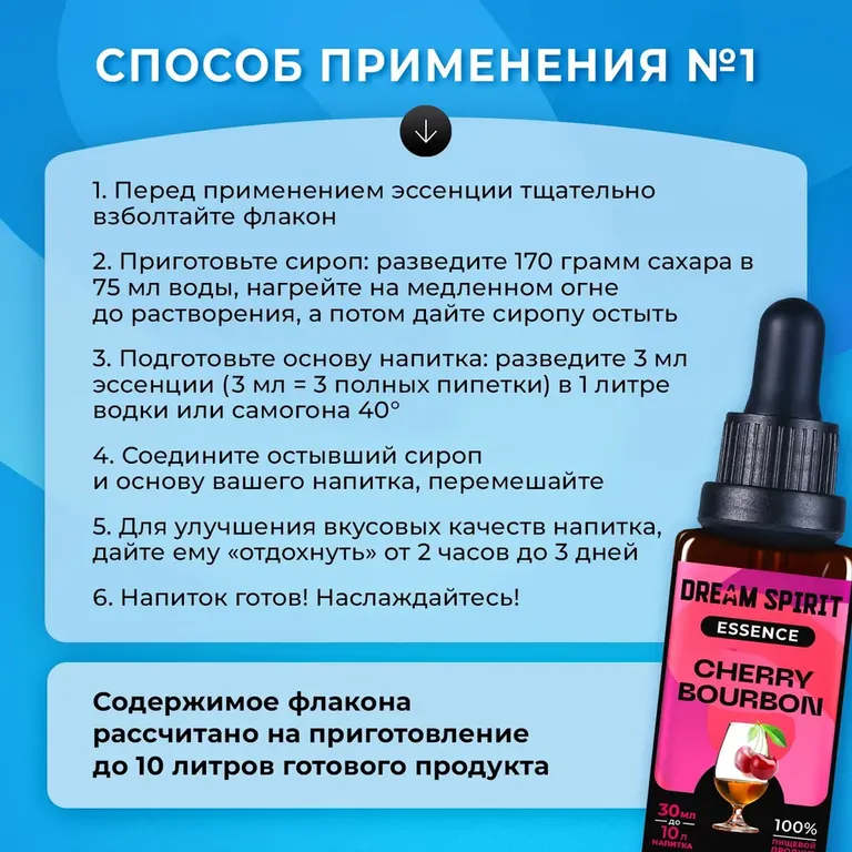 Наша эссенция также идеально подходит для создания коктейлей и кулинарных шедевров. Пробуйте добавлять Dream Spirit "Вишневый бурбон\Cherry Bourbon" в десерты, выпечку, торты или сиропы, чтобы придать им восхитительный вкус и аромат.