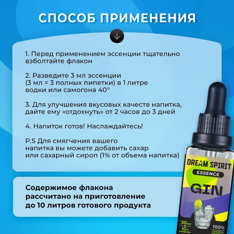 Эссенция Dream Spirit "Джин\Gin" также идеально подходит для создания изысканных коктейлей (Джин-Тоник, Том Коллинз, Авиация и др.) или для добавления уникального акцента в кулинарные шедевры, десерты, пропитки, выпечку и сиропы. Впечатлите своих гостей и близких неповторимым вкусом и ароматом!