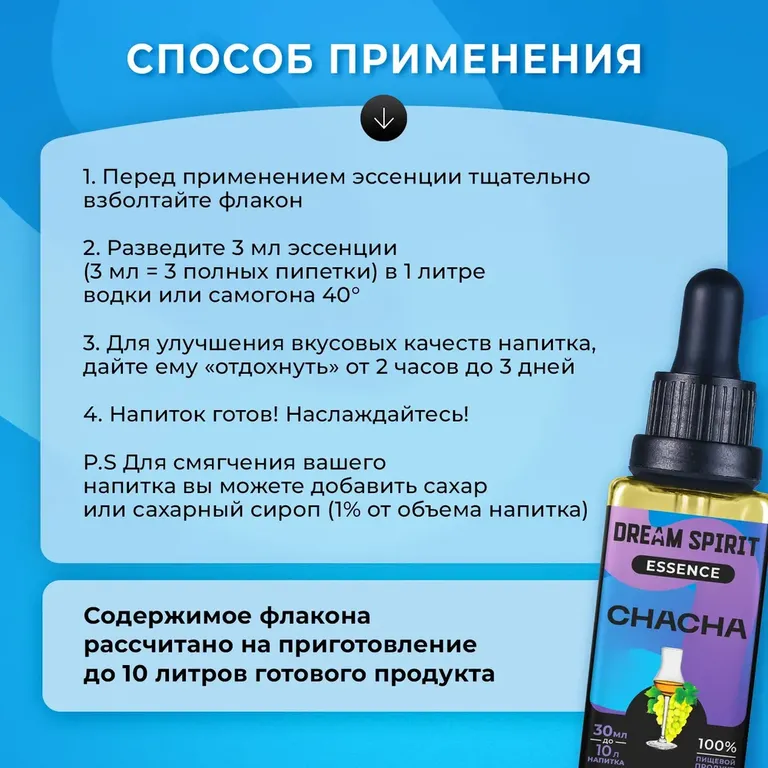 Окунитесь в мир теплого южного гостеприимства с эссенцией "Чача\Chacha" от Dream Spirit! Откройте для себя древний алкогольный напиток, который был символом радушия и душевности застолья на протяжении веков. Насладитесь пьянящим ароматом и терпким вкусом спелых южных фруктов и ягод, привнесенных этой удивительной эссенцией. Наша эссенция также прекрасно подходит для разнообразных коктейлей и кулинарных экспериментов, позволяя вам придать новые яркие оттенки вашим десертам и выпечке.