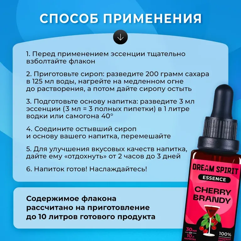 Окунитесь в мир чарующего и роскошного вишневого бренди с эссенцией Dream Spirit "Черри-бренди\Cherry Brandy", которая подарит вашему напитку яркие и сочные оттенки спелых вишен, наполнив каждый глоток гармоничным сочетанием фруктовой сладости и изящных древесных нот. Превратите вашу вечеринку в настоящее гастрономическое событие, добавив немного эссенции "Черри-бренди\Cherry Brandy" в ваш дистиллят или водку. Эта эссенция также идеально подходит для создания разнообразных коктейлей и кулинарных экспериментов. Добавьте неповторимый вкус и аромат вашим десертам, пирогам, выпечке, кексам и тортам, удивите своих гостей настоящими шедеврами.