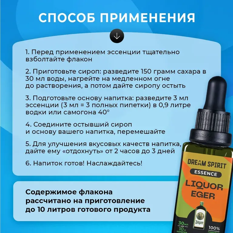 Эссенция «Ликёр Егерь\Liquor Eger» была вдохновлена популярным во всем мире немецким ликером. Его травяной, пряный вкус с ноткой корицы и апельсина согревает в холодную пору, хорош он, как в коктейлях, так и как самостоятельный напиток. Теперь вы с легкостью сможете разнообразить им свой домашний бар и поэкспериментировать с яркими вкусами.