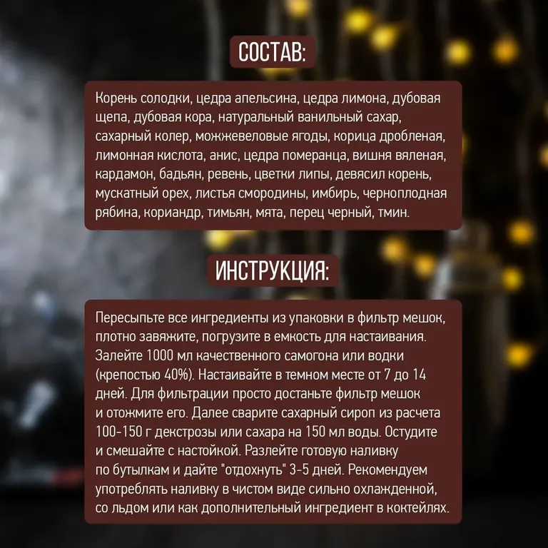 Одна из лучших домашних вариаций знаменитого немейкого ликёра. Состав из 27 специально подобранных ингредиентов создаёт неповторимый вкус, аромат и цвет напитка.