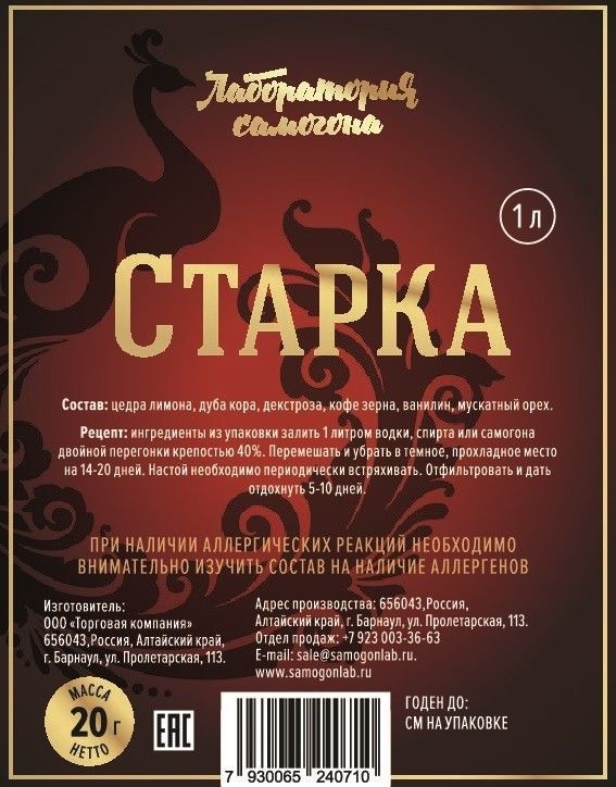 Состав: лимона корка, дуба кора, декстроза, кофе зерна, ванилин, мускатный орех.